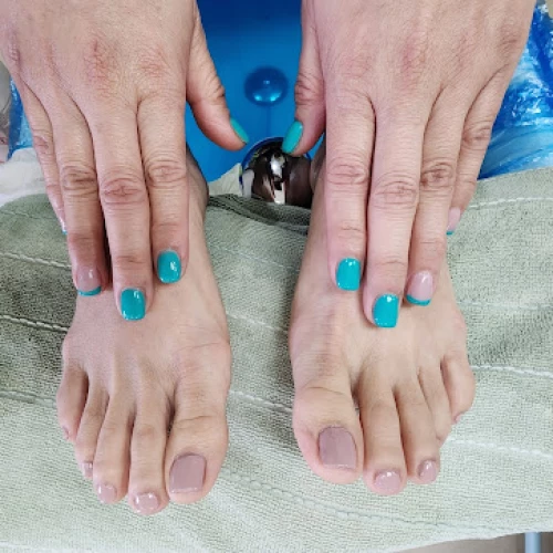 The salon’s interior balances bright, energizing lighting with comfortable seating, creating a space that feels both lively and relaxing. A color wall displays an extensive palette of polish options, while nail art showcases inspire creativity and confidence in service choices. Complimentary beverages, including coffee, tea, and water, add a hospitable touch, inviting clients to unwind during their visit.